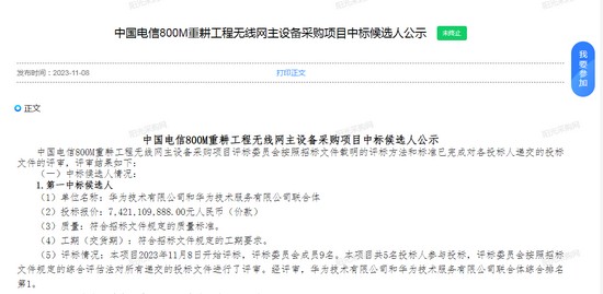 此次集采共有五家企業入選,第一中標候選人為華為技術有限公司和華為技術服務有限公司聯合體,投標報價為74.21億元;第二中標候選人為中興通訊股份有限公司,投標報價為74.21億元;第三中標候選人為上海諾基亞貝爾股份有限公司,投標報價為53.90億元;第四中標候選人為愛立信(中國)通信有限公司,投標報價為59.98億元;第五中標候選人為大唐移動通信設備有限公司,投標報價為58.80億元。