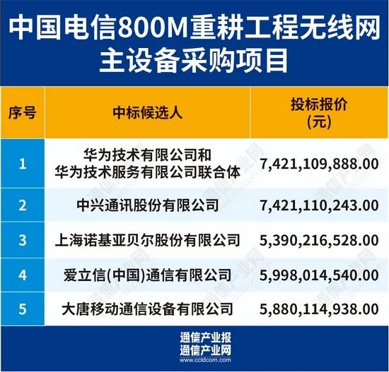 11月8日,中國電信發布了800M重耕工程無線網主設備采購項目中標候選人名單,華為、中興、大唐移動、諾基亞、愛立信五家企業入選。