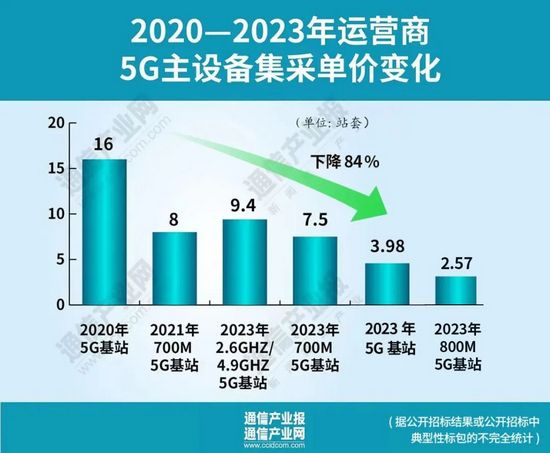 5G發牌四年來,在產業鏈的共同努力下,不完全統計,5G基站每站(套)的價格從2000年的16萬下降到今天2.57萬,累計下降84%。目前價格不到當初的兩成。