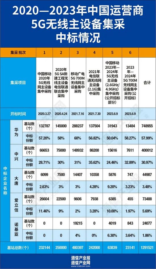 2020年至今,中國電信、中國聯通、中國移動、中國廣電一共進行了八次5G無線主設備的公開集中采購招標(以公示為標準),以及若干次單一來源采購。由于在單一來源及部分公開招標采購中,運營商未公布各中標廠商的具體中標份額,因此僅針對六次公開招標份額計算,華為中標份額最多,其次是中興通訊,愛立信、大唐移動和諾基亞分列三到五位。