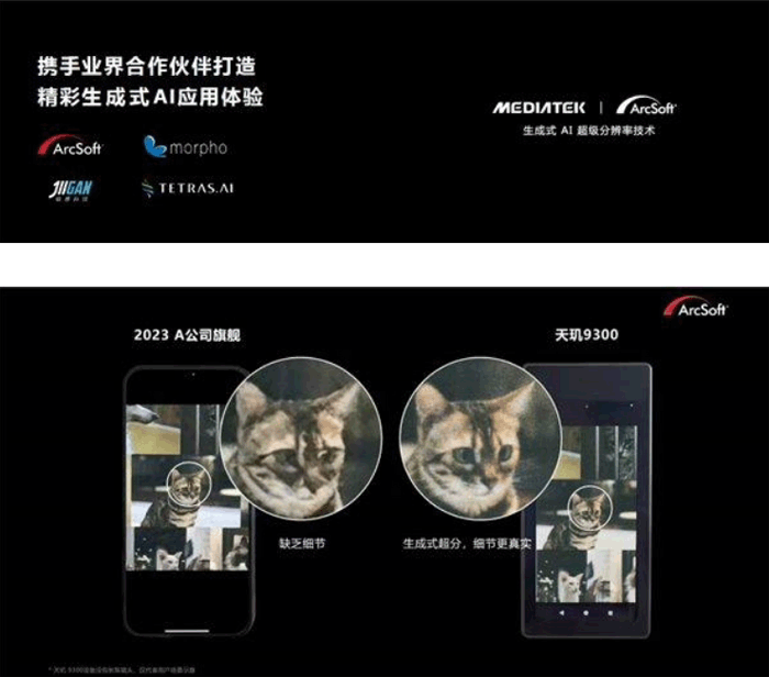 聯發科還攜手業界合同伙伴打造精彩的生成式 AI 應用體驗。虹軟的生成式 AI 超級分辨率技術基于天璣 9300 APU 邊緣計算能力,相比前代,性能可提升 30%。在 25 倍放大的拍攝時,利用生成式 AI 超級分辨率技術,可以拍出細節更真實的圖像效果。