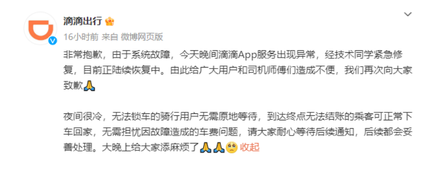 滴滴深夜道歉:由于系統(tǒng)故障,滴滴APP服務(wù)出現(xiàn)異常。滴滴出行官博針對服務(wù)出現(xiàn)異常發(fā)文回應(yīng),全文如下: