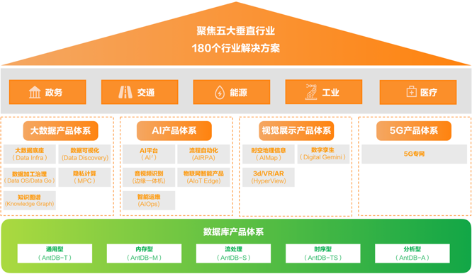 AntDB數據庫與亞信科技全棧產品深度融合,構建起以系列數據庫產品為中心,以大數據、AI、視覺展示、5G專網產品為輔助的“一中心四輔助”軟硬件產品體系,并基于該體系形成180個行業解決方案,助力客戶全方位推進數智化轉型升級。