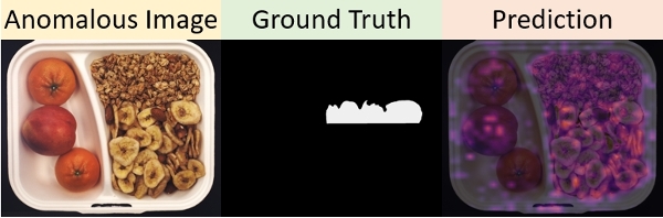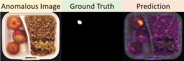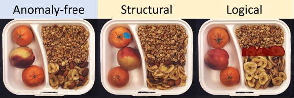 左:正常圖像;中:結構異常(橘子皮破損);右:邏輯異常(同一格子中食物放置的比例不對)