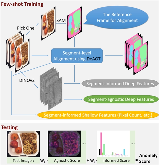1. 在訓練場景,SegmentAD首先將圖片上的物體逐像素提取出來,每一個像素,SegmentAD都知道它屬于哪個物體。同時,不同圖片之間,SegmentAD會對齊物體的定義。通過這樣的逐像素提取,SegmentAD獲得了圖片上物體的位置和面積等信息,這類信息與邏輯異常直接相關——假如某個物體的面積發生變化或者位置不正確,那么這個物體一定是一個異常物體。同時,SegmentAD參考傳統的基于特征的方法,將圖像的其它特征基于預訓練大模型提取出來,這些特征可以直接用來發現結構異常——假如有一個特征與別的特征差異較大,那么它很可能是個結構異常特征。