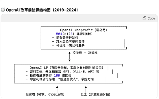 首先要解釋一下OpenAI復雜的不同尋常的股權結構。2015年馬斯克和奧特曼聯合諸多科技行業人士創辦的OpenAI是一家非營利性質的研究機構,依靠馬斯克等超級富豪和行業公司的捐贈,也沒有股東分紅。因此,OpenAI在美國稅法中根據501(C)非營利性質享受著免稅待遇。