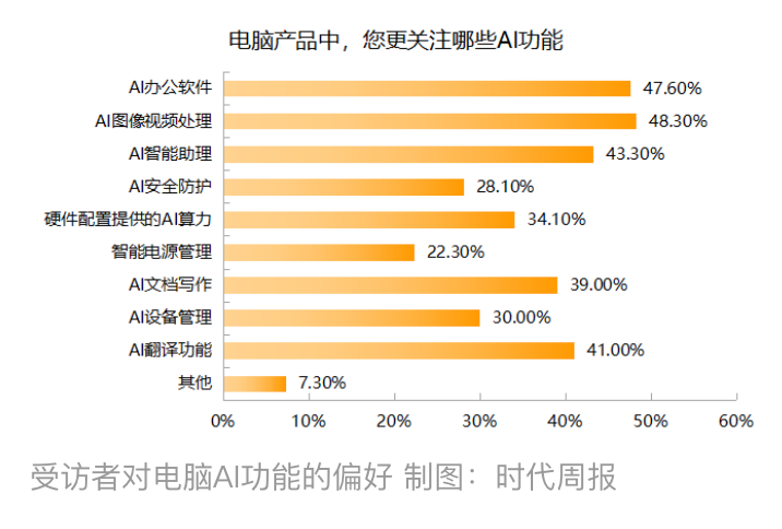 對消費者而言,技術嘗鮮或是購買AI數碼產品的一大原因,但功能實用性無疑仍是決定性因素。具體到功能層面,如在電腦產品中,最受關注的前五位AI功能是AI圖像視頻處理、AI辦公軟件、AI智能助理、AI翻譯功能和AI文檔寫作;在手機產品中,則是AI翻譯、AI語音智能助手、AI相機、AI健康檢測和AI識圖;在學習硬件產品中,則是多思路解題、AI口語訓練、學習路徑規劃、AI作業批改以及護眼與坐姿管理。