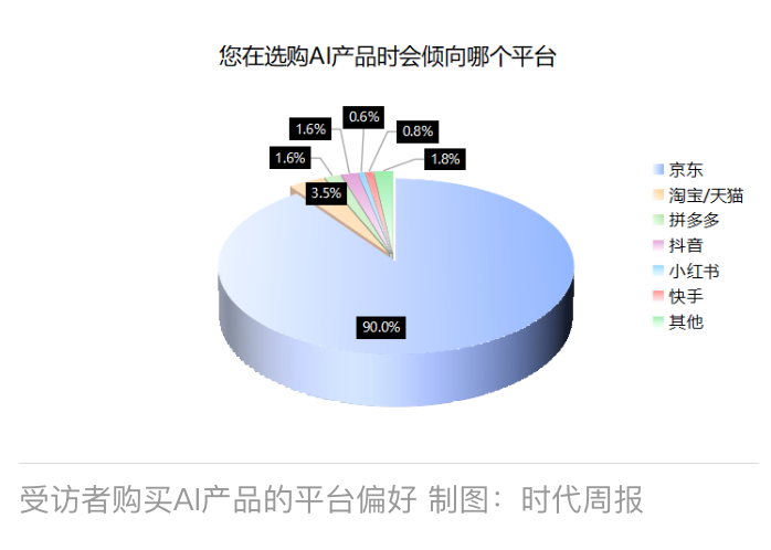而在平臺選擇上,京東成為消費者購買AI產品時的主要渠道,且與淘寶/天貓、拼多多等平臺的份額拉開很大差距。京東敏銳捕捉到需求變遷,重點運營九大AI數碼產品品類,包括AI機器人、AI眼鏡、AI手機、AI電腦、AI平板、AI教育硬件、AI智能音箱、AI家庭存儲、AI電紙書等。銷售數據層面,AI相關商品更是成為不折不扣的黑馬。