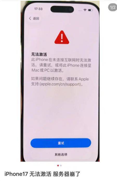 據紅星資本局,自10月13日晚開始,多地多名用戶反映,其新購買的iPhone 17及iPhone 17 Pro Max無法激活,這一問題持續至10月14日上午仍未得到解決,在社交媒體上引發關注。