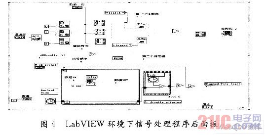 實驗中,將采集到的信號在虛擬儀器軟件LabVIEW中進行處理。具體處理如下所述:采集卡的3個通道中,第1,2兩個通道采集DSP通過緩沖驅動電路后的信號(其中一路信號需要將其延時);第3個通道采集送光電探測器探測到的信號。將3個通道的信號在同步節點下送入系統程序,程序后面板程序如圖4所示。