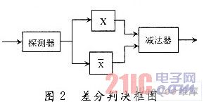在此,對信號進行差分檢測,如圖2所示。圖中X表示序列自相關解碼器;X表示序列與其共軛序列相關解碼器。對于m序列調制信號,在一個周期內對確定的延遲時間,X為最大值(歸一化后為1)時,X將取到最小值,這樣在判決端很容易判別信號。