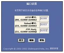 對于HTTP服務器,默認的端口號為80;對于Telnet(遠程登錄)服務器,默認端口號為23;對于FTP(文件傳輸),默認的端口號為21。你可以為任一服務器類型輸入一個范圍在61000~62000內的非標準端口號。在相應的文本框內輸入新的端口號并點擊"提交"按鈕即可。