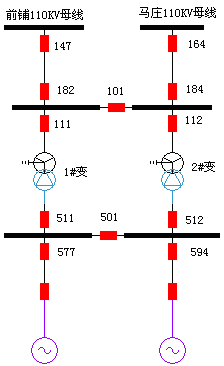 2005年初,隨著新冀熱電廠2×12MW的熱電機組在中華站10KV母線并網發電,我們對前鋪站的147開關、馬莊站的164開關的重合閘采用檢線路無壓重合,中華站#1、2變的110KV側中性點采用間隙接地的方式。由于中華站的182、184開關在設計之初便作為負荷開關使用,并未裝設保護裝置,110KV母線也未裝設母差保護,即使在新冀熱電廠接入系統時,也因各種原因未進行改造、完善,因此,當110KV系統發生故障時,中華站側只能依靠電廠聯絡線的低壓、低頻解列保護或#1、2主變的間隙保護或備自投的低電壓跳閘切除故障。