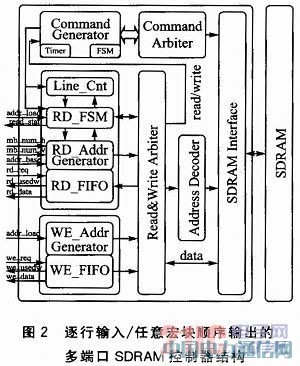 逐行輸入/任意宏塊順序輸出的多端口SDRAM控制器的整體結構如圖2所示。