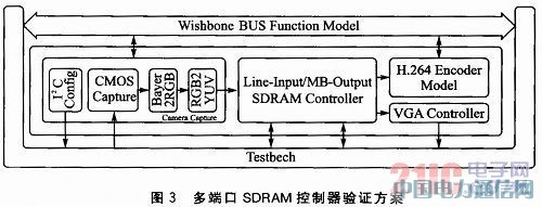 設計了一個H.264編碼器模型,它主要實現的功能就是模擬H.264編碼器與SDRAM控制器接口處的讀時序,從SDRAM中讀取數據。同時,它也帶有一個Wish-bone從接口,可以把讀取的數據傳送給OR1200微處理器,OR1200微處理器再經過網口把圖像數據傳送到PC機,以驗證所讀取的數據是否正確。利用Wishbone總線功能模型(BFM)在ModelSim SE 6.5f環境下對所設計的模塊進行了RTL級的仿真,驗證方案框架圖如圖3所示。