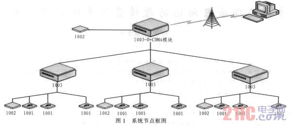 傳感器節(jié)點(diǎn)將采集到的溫濕度數(shù)據(jù)通過尤線通信的方式傳到分節(jié)點(diǎn)1003,每個分節(jié)點(diǎn)1003將收到的信息發(fā)送到主節(jié)點(diǎn)1003-D,1003-D通過串口將數(shù)據(jù)傳送到CDMA模塊,由CDMA網(wǎng)絡(luò)將數(shù)據(jù)傳送到遠(yuǎn)端的PC機(jī)上。底層節(jié)點(diǎn)1001和1002都有自己的專屬ID,以便上位機(jī)進(jìn)行區(qū)分溫度節(jié)點(diǎn)。1003節(jié)點(diǎn)也被賦予了自己的ID,平常所有的節(jié)點(diǎn)大部分時間都在睡眠模式,當(dāng)上位機(jī)對某一個倉發(fā)送采集命令時,命令通過CDMA網(wǎng)絡(luò)傳送到1003-D節(jié)點(diǎn)上,然后1003-D節(jié)點(diǎn)向下一層節(jié)點(diǎn)1003發(fā)送喚醒命令,相應(yīng)的1003被喚醒后開始發(fā)送喚醒其所屬的1001和1002節(jié)點(diǎn)的命令,傳感器節(jié)點(diǎn)1001和1002采集數(shù)據(jù)后然后向上一級節(jié)點(diǎn)傳送,最后通過1003-D經(jīng)CDMA網(wǎng)絡(luò)傳到上位機(jī),由上位機(jī)軟件進(jìn)行分析與處理。