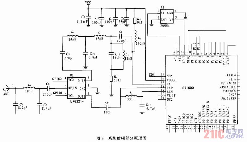 Si1000中集成了射頻收發(fā)模塊,這大大地節(jié)省了系統(tǒng)所耗費(fèi)的資源。它的可使用的頻率范圍為240~960 MHz,輸出功率已達(dá)+20 dBm,接收靈敏度達(dá)到-121 dBm,自帶了發(fā)送和接收FIFO。