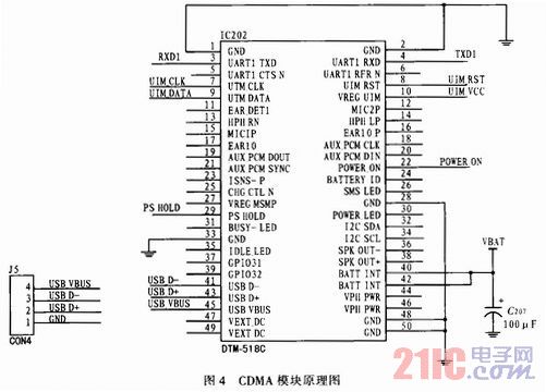 系統(tǒng)CDMA模塊選用的是Anydata公司生產(chǎn)的DTM518C。該模塊支持CDMA 800頻段EVDO Rev A;超低的功耗電流(待機(jī)<1.5 mA/關(guān)機(jī)<10μA /最大工作電流<580 mA);工作溫度范圍為-35~+75℃;電源電壓范圍為3.3~4.2 V。單片機(jī)選用的是PIC18F14j11單片機(jī),它是一種引腳低功耗,高性能的單片機(jī),最大容許輸出電壓為5.5 V,工作電壓范同是2.0~3.6 V。