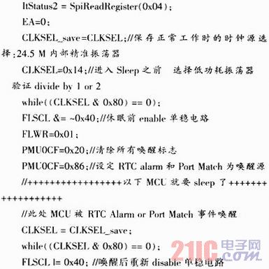 傳感器節(jié)點(diǎn)的工作周期設(shè)定為5 s,5 s中的4.995 s處于低能耗的休眠狀態(tài),剩余的5 ms偵聽信道0,如果有自己的喚醒命令,就不再休眠,如果沒有,就繼續(xù)休眠。傳感器節(jié)點(diǎn)(1001節(jié)點(diǎn))與簇頭路由節(jié)點(diǎn)的通信波特率是115.2 kbps,即傳感器節(jié)點(diǎn)每秒可以發(fā)送115 200個二進(jìn)制位。經(jīng)過試驗(yàn)檢測,當(dāng)前導(dǎo)碼為5個字節(jié)、有效載荷為26個字節(jié)時,發(fā)送一個數(shù)據(jù)幀所耗時間約為1.83 ms。當(dāng)偵聽窗口為5 ms時,至少可以保證有兩個喚醒命令幀被傳感器節(jié)點(diǎn)捕獲的到,系統(tǒng)中作此設(shè)計,正是增強(qiáng)通信魯棒性的考慮。節(jié)點(diǎn)低功耗代碼如下: