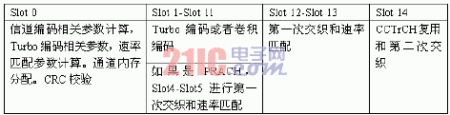 在一個TTI周期為10ms的通路中上行編碼各階段所占用的時隙分配如表1。該TTI周期所需的信道編碼參數(shù)在該slot 0確定,并且由傳輸格式半靜態(tài)參數(shù)和動態(tài)參數(shù)計算出Turbo或卷積的編碼參數(shù)和速率匹配參數(shù)