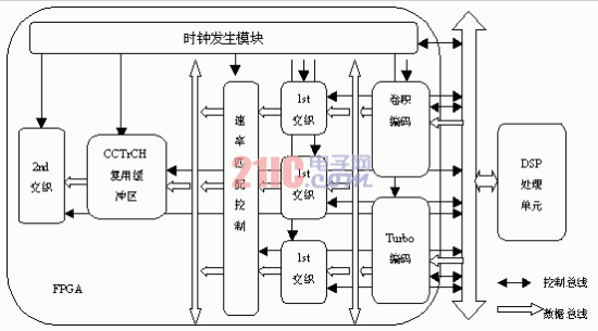 FPGA完成信道解碼中的各個具體模塊的實現(xiàn),并且每個功能模塊提供相應的控制接口。DSP通過這些控制接口對各硬件模塊進行參數(shù)配置、任務調(diào)度,從而控制多個下行傳輸信道的解碼過程,并能夠最大限度的調(diào)度各個功能模塊為多個傳輸信道服務,這樣實現(xiàn)了各個功能模塊為多個傳輸信道所共享,提高同時處理多路下行信道的能力。整個流程充分考慮到了DSP和FPGA各自的優(yōu)缺點,通過軟硬件的相互配合,協(xié)同處理來提高整個系統(tǒng)的性能。