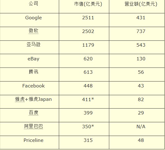 注釋:雅虎和雅虎日本是兩家單獨上市的公司,雅虎持有部分雅虎日本和阿里巴巴的股份,因此市值有重復(fù)計算。